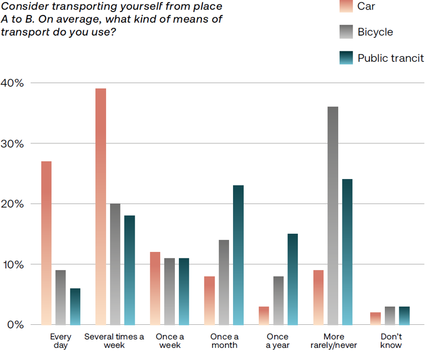 One effect of this development might be that cycling has become more popular over the past year, according to the survey. 40 percent now say they use a bike at least once a week, compared to 33 percent in 2023, making it the second most popular means of transportation.