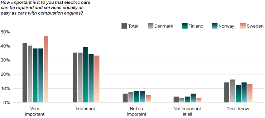 In Sweden, opinions are the strongest. Here, 79 percent believe it is important that their new electric car can be repaired and serviced just as easily as their previous car, followed by Finland (77), Denmark (75), and Norway (72).