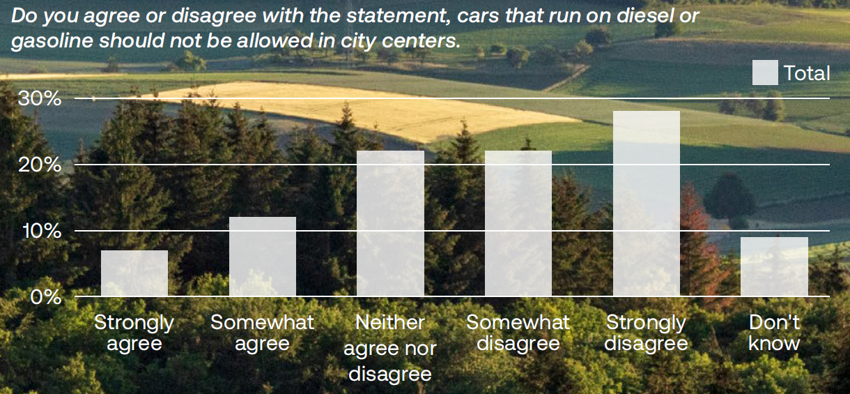 However, the public is unconvinced. 19 percent agree that fossil fuel cars should be banned from city centers, while 50 percent oppose this idea. Younger people, particularly those aged under 35, are more supportive, with 25 percent agreeing with a ban, compared to only 16 percent of those aged 65 and older. Similarly, urban residents are more supportive of a ban compared to their rural counterparts.