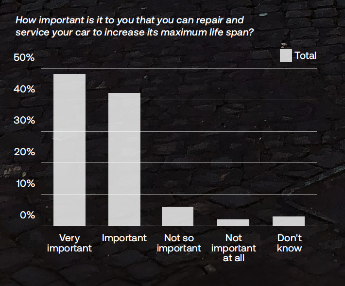 People in Finland see this as fundamental, with 95 percent stating that the option to service and repair your car to reach its maximum lifespan is important. Finland is followed by Sweden (91), Norway (87), and Denmark (84). At 11 percent, Denmark also holds the largest share of people disagreeing that this is important.
