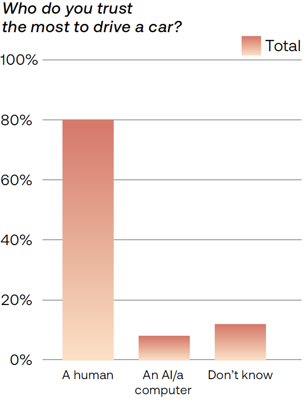 Many in the Nordic countries seem to be hesitant about the new technology, according to the Mobility Barometer. A clear majority of 80 percent say they trust a human most to drive a car. Only 8 percent trust a computer or AI more, while 12 percent have no preference.