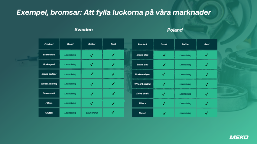 Arbetet med portföljen följer modellen Bra–Bättre–Bäst, som gör det möjligt att täcka olika kundbehov på varje marknad. En anpassning gäller exempelvis bromsar, där Sverige saknar instegssegmentet “Bra”, medan Polen ännu inte har “Bättre”. Strategin är att fylla dessa luckor så att varje marknad får en komplett Bra–Bättre–Bäst-struktur.